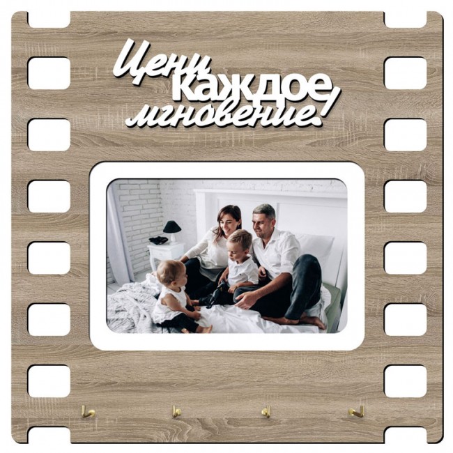 Ключница 26х26 арт. k10_dub выполнена в форме фрагмента фотографической пленки. По краям настенной площадки проходит стилизованная перфорация. Основной фон ключницы – древесная текстура дуба приятного кофейного оттенка. В центре композиции расположена фотография счастливой семьи (мама, папа, два ребенка), вставленная в стильную белую рамку. Кадр запечатлевает семейную идиллию приятного общения. Надпись «Цени каждое мгновение» в верхней части создает особый настрой на гармонию и позитив. Нижняя часть оснащена четырьмя удобными крючками для подвешивания связок ключей.