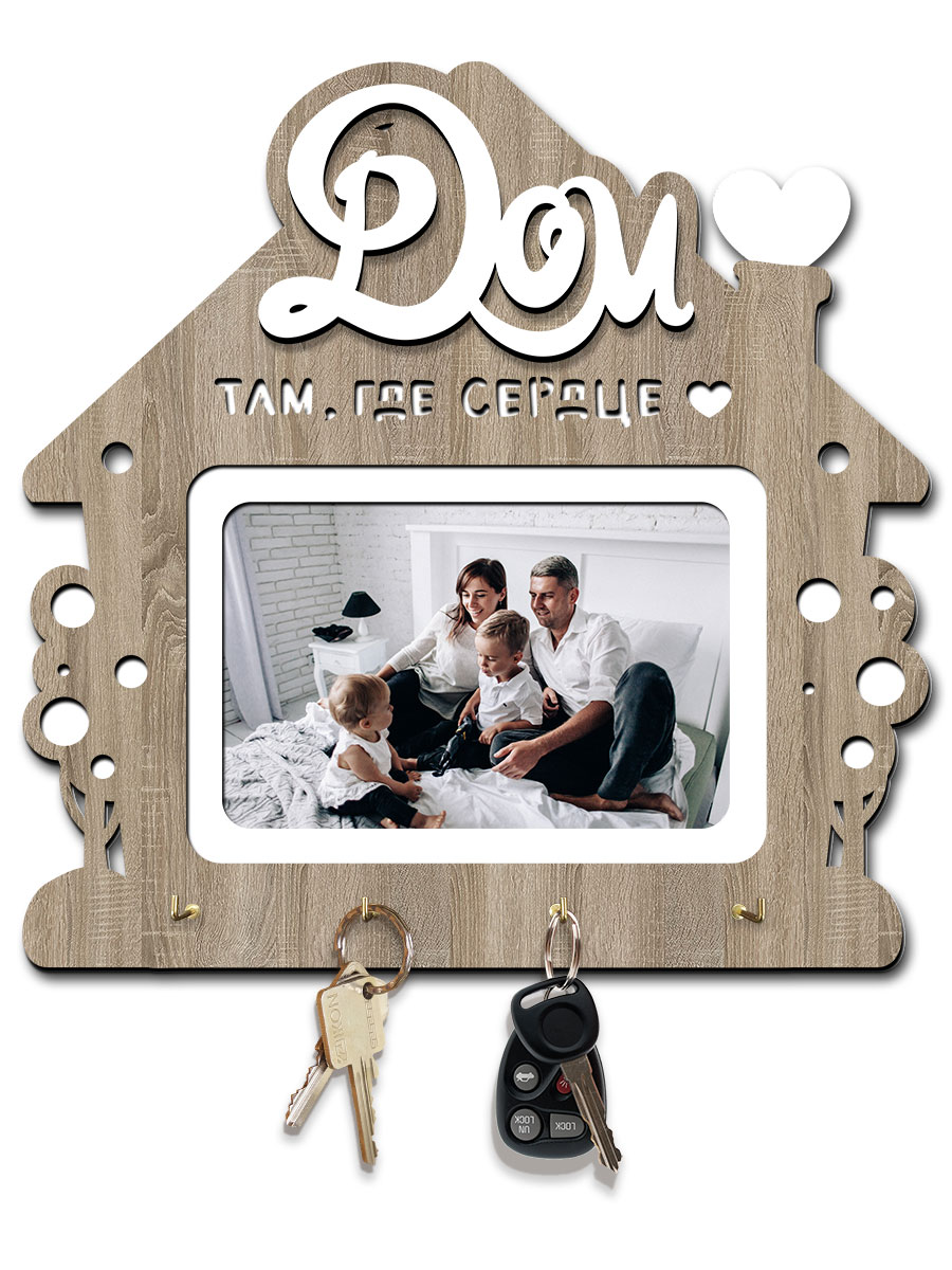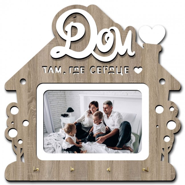 Ключница 26х26 арт. k11_venge будет полезна в каждом доме. С ней у каждой связки ключей теперь будет свое место, они больше не будут разбросаны в прихожей и по дому, а вам не придется тратить время на поиски. В данной модели предусмотрено четыре крючка, выполненных из металла. Они способны выдержать даже массивные связки ключей. Изделие выполнено из натурального дуба и имеет форму небольшого, но уютного домика. В качестве украшения здесь выступают резные фигуры, сердечки и красивая надпись: «Дом там, где сердце». В центре предусмотрено место для вашей фотографии, что позволит сделать ключницу по-настоящему уникальной и неповторимой.